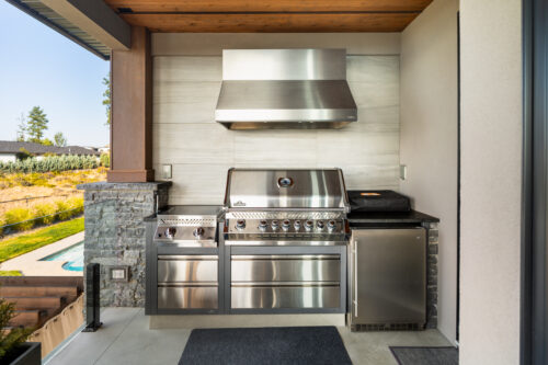 The main level was thoughtfully planned for both everyday living and entertaining at scale. A chef-inspired kitchen featured Thermador appliances, a functional oversized island, and a butler’s pantry—seamlessly flowing into the open living and dining areas. From here, oversized doors opened to the covered deck complete with a full outdoor kitchen, ceiling fan, built-in heaters, and automated blinds, making year-round entertaining effortless.