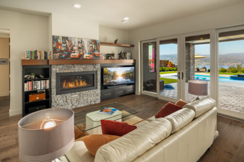 Built by renowned builder Bill Frame, the home showcased exceptional craftsmanship throughout. Wide-plank wood flooring, soaring ceilings, and expansive walls of glass framed the Okanagan landscape as living art—creating a sense of calm, scale, and connection to the outdoors.