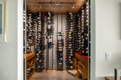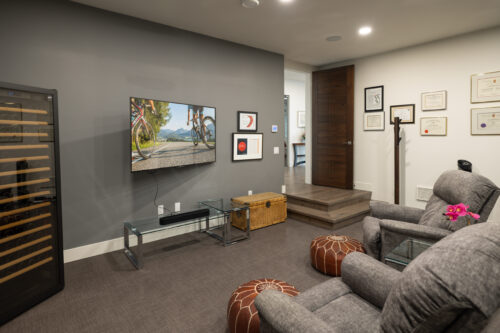 The lower level was designed to impress, offering generous spaces to gather and unwind. Highlights included a wet bar, temperature-controlled wine room, fitness area, and expansive recreation and family rooms. Walls of glass opened directly to the backyard oasis—where a heated saltwater pool, pergola-covered hot tub, fire pit, and lounging areas created a true resort-style experience at home.