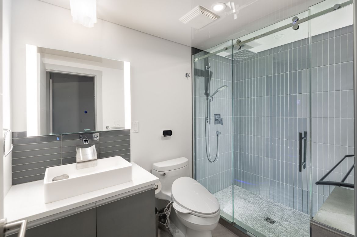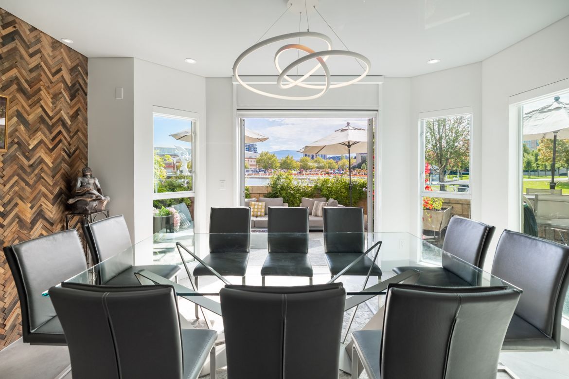 The decadent kitchen was made for a chef and entertaining with a large island, high-end Sub-Zero and Wolf appliances, glass wine cellar and fridge plus custom cabinetry. The indoor/outdoor wet bar is perfect for an afternoon cocktail after a day on the boat or relaxing at a nearby beach. The dining space with a feature wall repurposed from 1500 century wood wall tiles is a generous size with access to the patio and flows to the living room with a beautiful concrete panel fireplace. Brilliantly designed with a main floor bedroom or office, and luxury guest bathroom complete with a walk-in shower.
