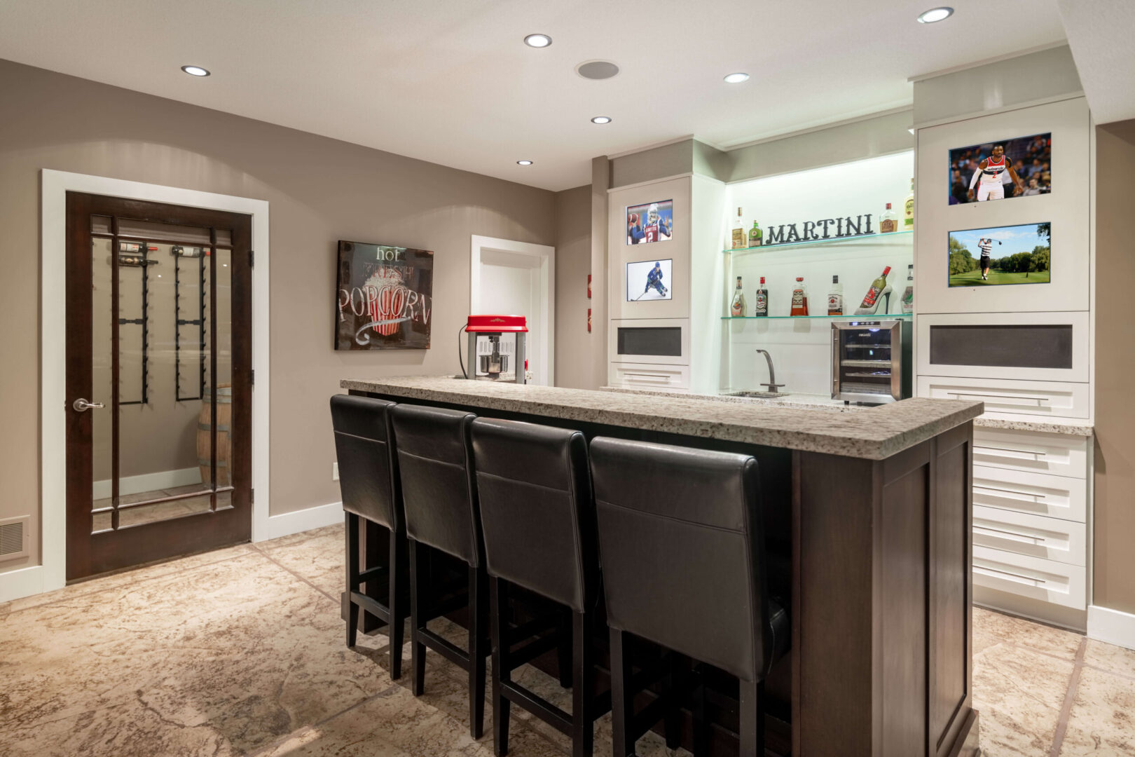 Hidden Lake living in Wilden! Exquisitely appointed and masterfully designed, this former show home boasts an outdoor sanctuary paired with a beautiful home creating a one-of-a-kind property on a quiet cul-de-sac. Quality and craftsmanship is apparent from the moment you enter the interior with a water feature, fireplace and exquisite Hidden lake views. The open concept main living space was designed to perfection with notable detail and a large entertaining area. Chef's will be impressed by the gourmet kitchen equipped with 2.5" granite, an oversized island and expansive butlers pantry. Enjoy evenings on the view deck with a built-in BBQ, motorized window coverings and an outdoor fireplace overlooking the pool and lake below. The primary suite is perfectly positioned to enjoy the private lake view and includes a divine ensuite. A formal dining or den/office, guest bathroom and laundry complete the main floor. The walk out lower level includes in-floor heating, a wine cellar and two additional bedroom options with a lavish bathroom. Curate a cocktail at the luxury wet bar with 4 TV's or watch a movie in the media room with built in speakers. The outdoor paradise will be cherished with a salt water pool, low-maintenance landscaping and direct access to the lake, nature and skating in the winter! At this incredible property, you will find spaces for relaxation, and places for entertainment enjoying a heightened quality of life. (id:43014)
