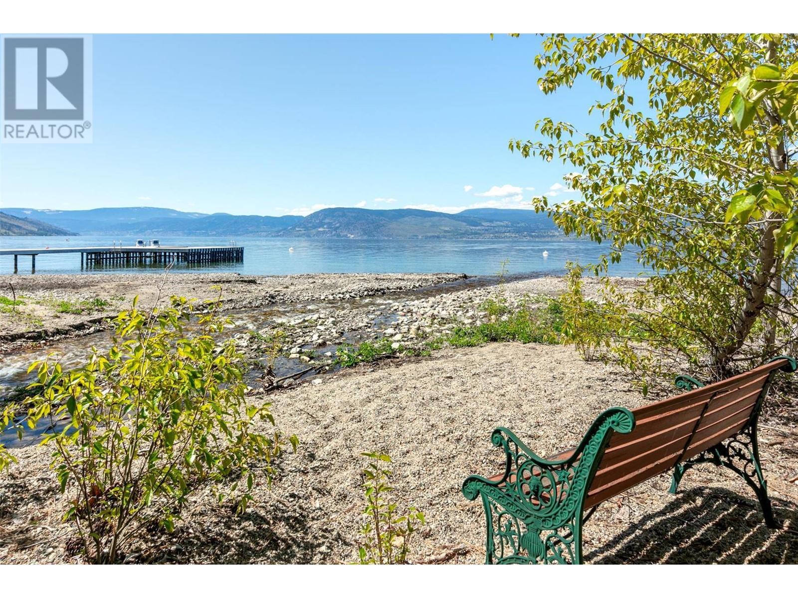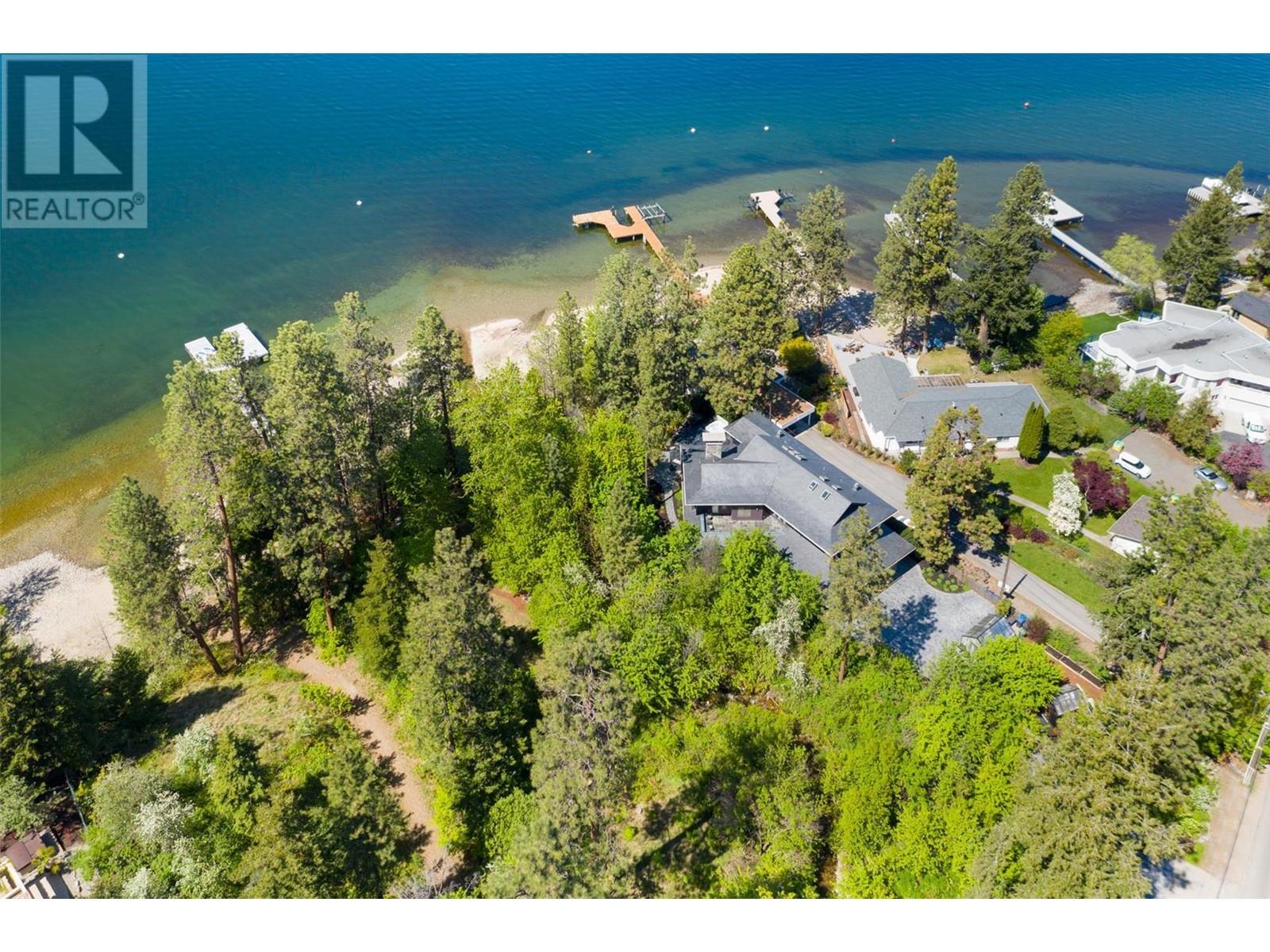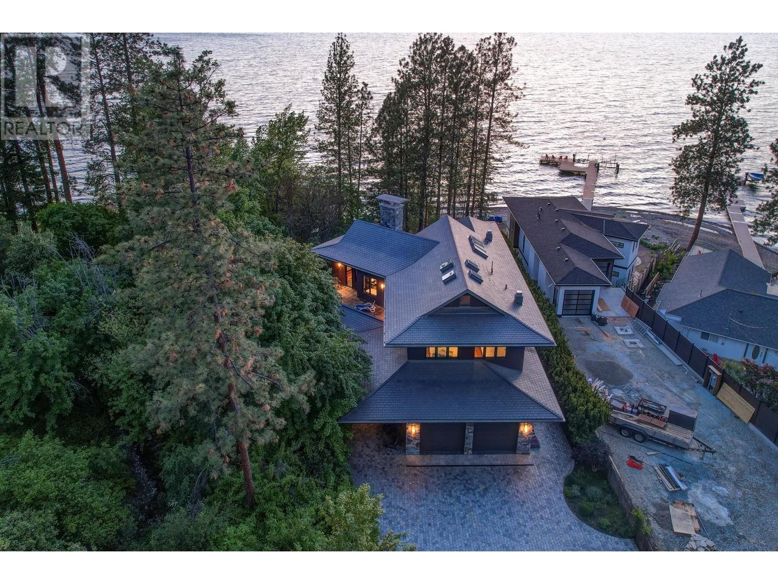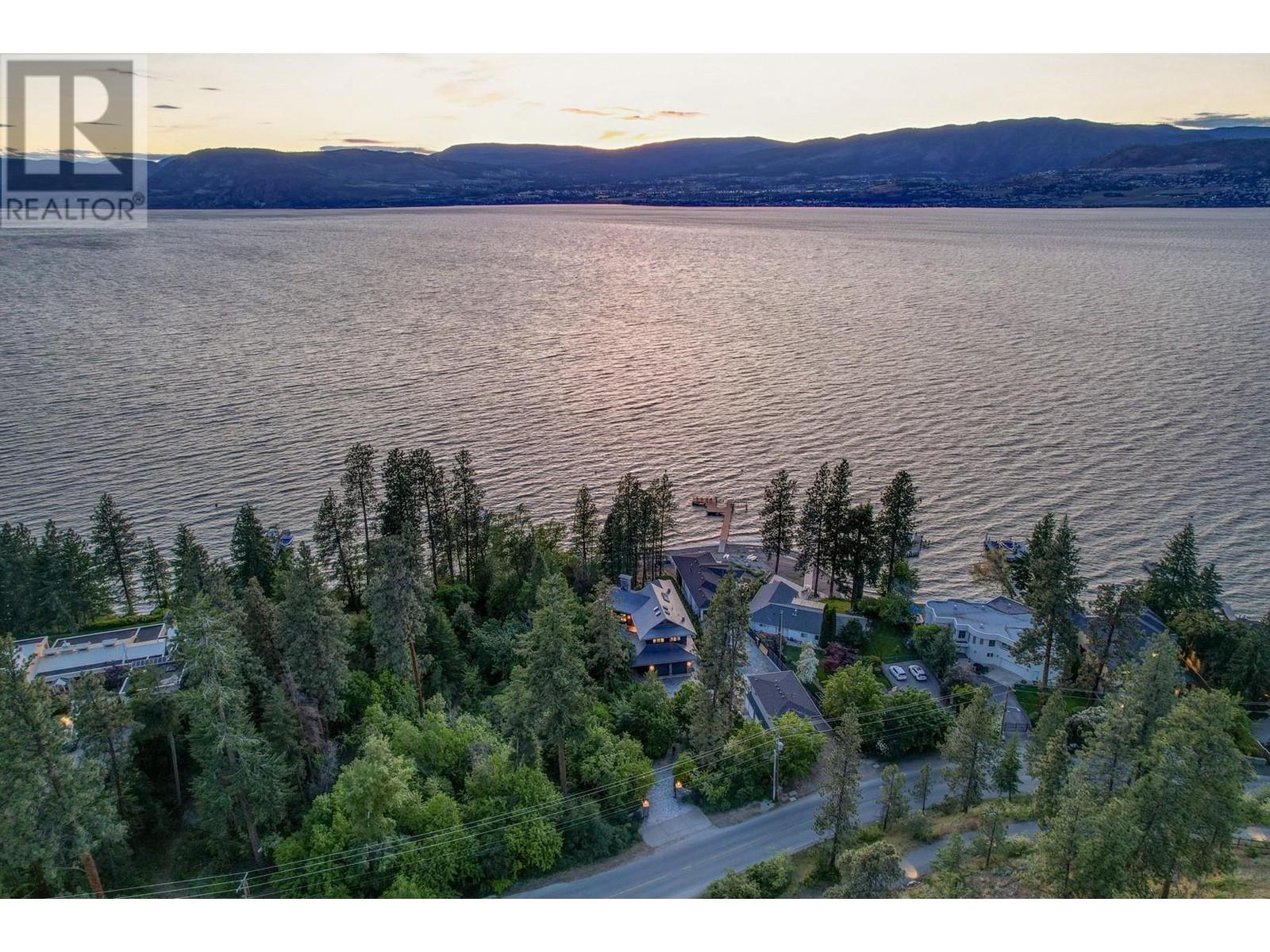 Tranquil Waterfront and Creekside Retreat. This gorgeous custom home is situated on a private 1.22 acre property along the shores of Okanagan Lake and offers 185 feet of water frontage. Lebanon Creek borders the property to the south. Designed by Architect Everest Lap and interior design by Ines Hanl this home is an energy efficient oasis ""connecting back to the earth."" Meticulous attention to detail and design is found throughout the over 4,600 sq ft residence with every room taking full advantage of the lake and forest views, bringing the outdoors in. Exterior has been finished with Kettle Valley granite and incorporates seamlessly into the surroundings. Natural materials span the home with custom rock and tile work, rich wood cabinetry, and beautiful walnut floors. Upon entry you'll notice the soaring 29 ft. ceilings in the kitchen creating a grand space for hosting and entertaining. The high-end kitchen features a curved island, custom Sycamore and Walnut veneer wood cabinets with professional appliances that will delight any chef. Living room was designed to hold a grand piano with a panel of 5 windows that accordion to the patio to allow for an unparalleled indoor to outdoor living experience. Backyard offers a swim spa and hot tub that are both privately nestled into the landscape. Well-designed and constructed wharf system at the beautiful expansive shoreline. For those seeking a tranquil retreat with seamless access to the waterfront this is the ideal property! (id:43014)