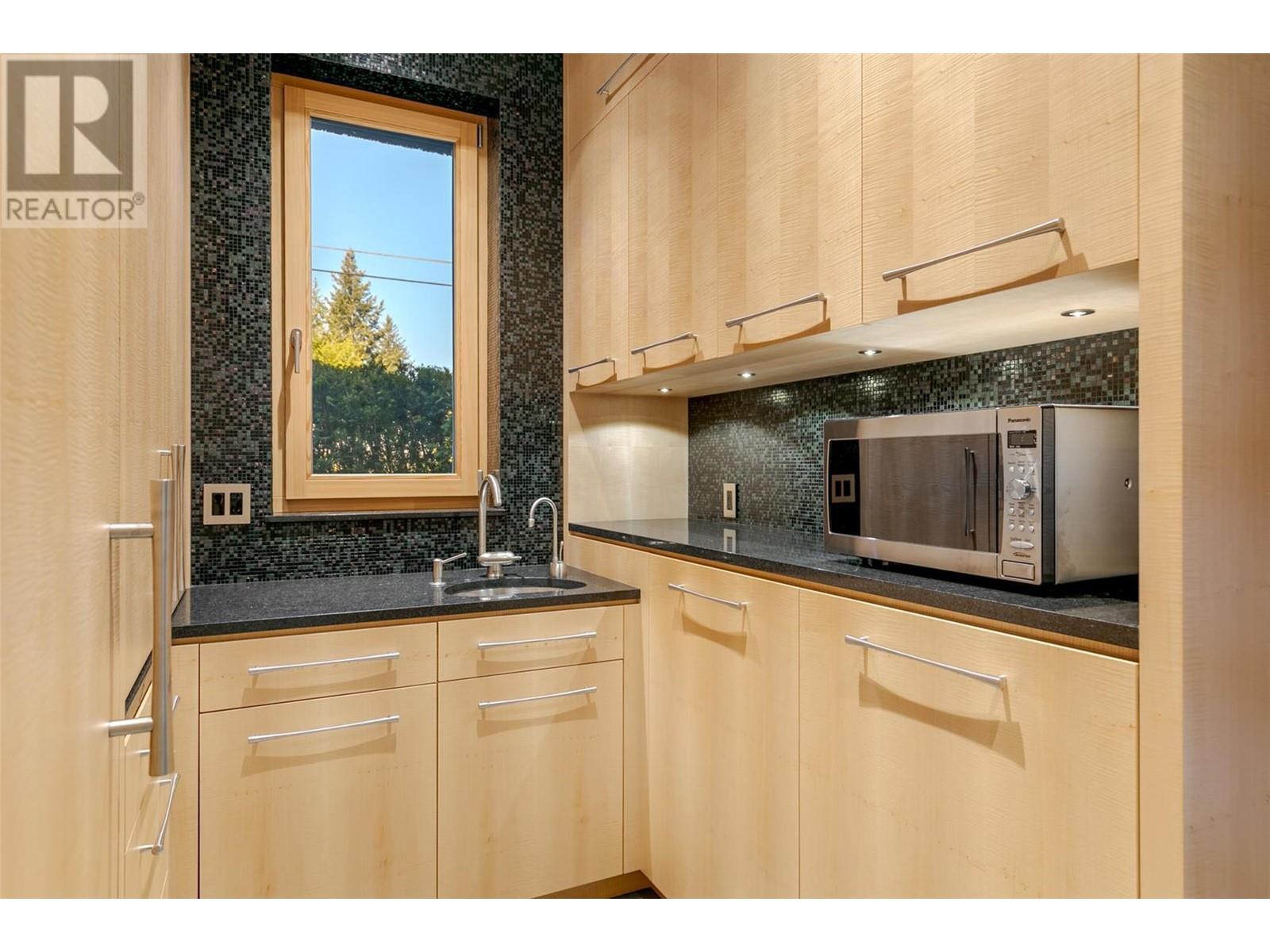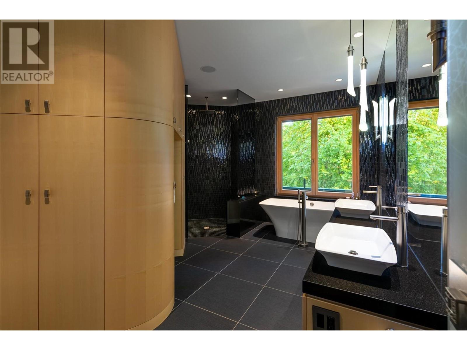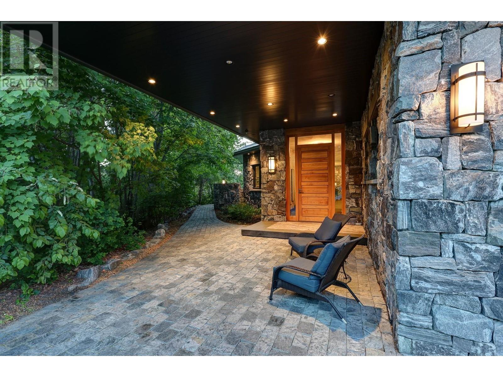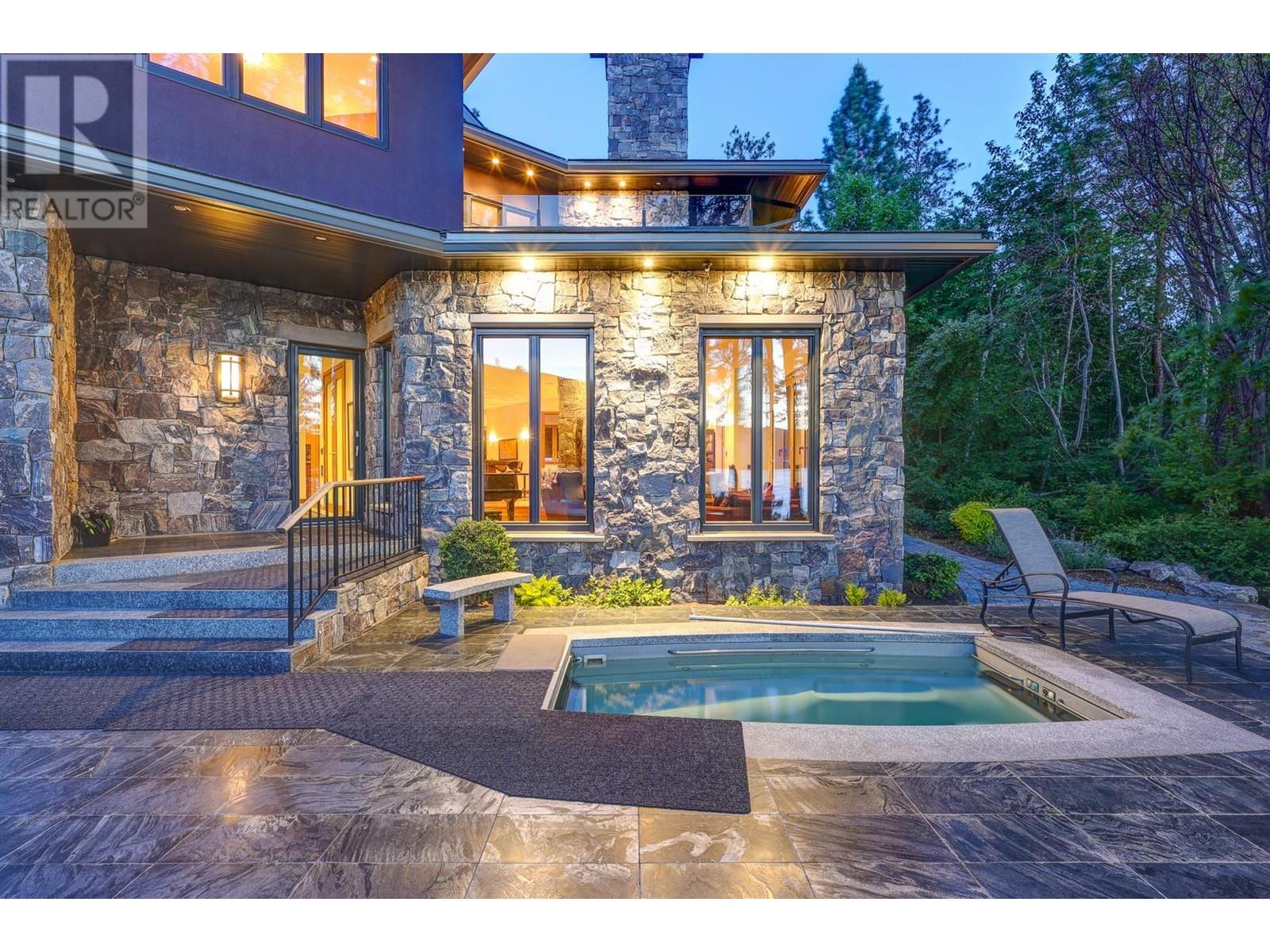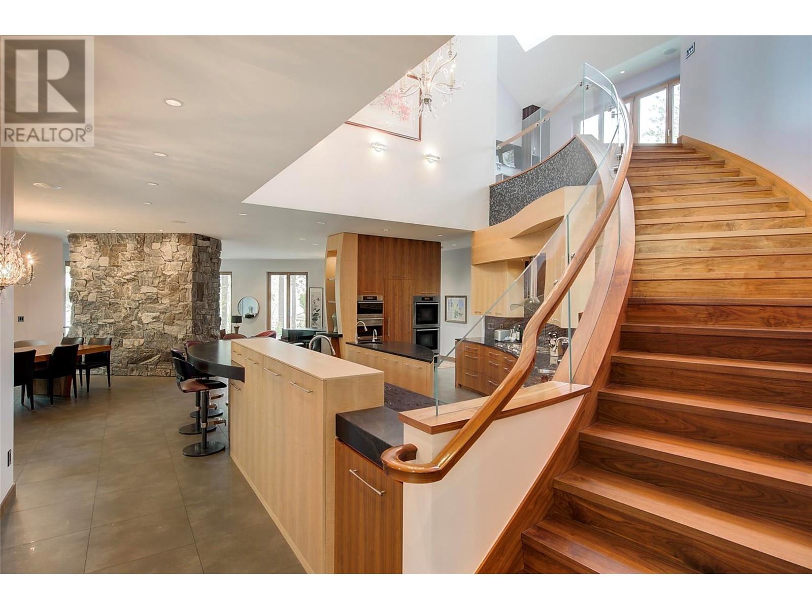 Tranquil Waterfront and Creekside Retreat. This gorgeous custom home is situated on a private 1.22 acre property along the shores of Okanagan Lake and offers 185 feet of water frontage. Lebanon Creek borders the property to the south. Designed by Architect Everest Lap and interior design by Ines Hanl this home is an energy efficient oasis ""connecting back to the earth."" Meticulous attention to detail and design is found throughout the over 4,600 sq ft residence with every room taking full advantage of the lake and forest views, bringing the outdoors in. Exterior has been finished with Kettle Valley granite and incorporates seamlessly into the surroundings. Natural materials span the home with custom rock and tile work, rich wood cabinetry, and beautiful walnut floors. Upon entry you'll notice the soaring 29 ft. ceilings in the kitchen creating a grand space for hosting and entertaining. The high-end kitchen features a curved island, custom Sycamore and Walnut veneer wood cabinets with professional appliances that will delight any chef. Living room was designed to hold a grand piano with a panel of 5 windows that accordion to the patio to allow for an unparalleled indoor to outdoor living experience. Backyard offers a swim spa and hot tub that are both privately nestled into the landscape. Well-designed and constructed wharf system at the beautiful expansive shoreline. For those seeking a tranquil retreat with seamless access to the waterfront this is the ideal property! (id:43014)